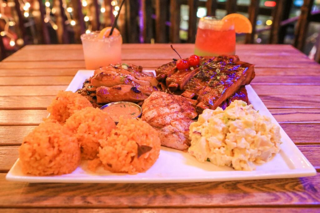 人気のあるカーニバルの盛り合わせには、魚のグリル、チェリーリブ、チキンのグリル、ポテトサラダ、チャモロ赤米などがあります。