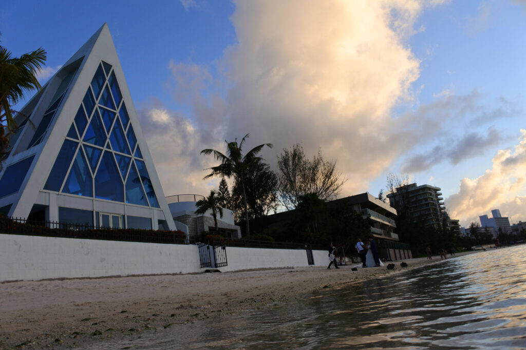 If you want to appreciate the beauty of Guam, you should start by jumping from the happy blue star church that is comparable to the rainbow! The exterior of the church is Greek-style, with a blue and white tone of the Aegean Sea, creating a Greek-style church with a pyramid-like shape that resembles a sailboat that symbolizes a new journey of life. The geometric blue glass forms a layer of light and shadow on the water surface, which is especially fascinating. The interior of the church is simple and generous, and the holy road is 12 meters long and is paved with white marble. The bright sunshine is scattered through the glass windows and scattered on the newcomers, adding a beautiful aura to the wedding.