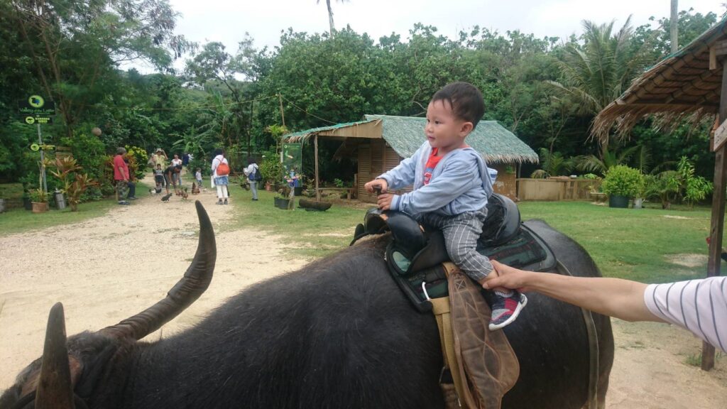 岸上幾位身穿查莫洛傳統服飾的年輕男子早已在岸邊準備迎接我們,接著介紹園區內的主要幾個體驗項目,一為查莫洛村莊體驗,二為傳統查莫洛人編織和生火體驗,三則為水牛騎乘體驗,還會有村長帶領著族人們為我們吟唱歡迎歌曲,清亮的嗓音,不用麥克風就以最自然的方式在河谷裡飄盪。